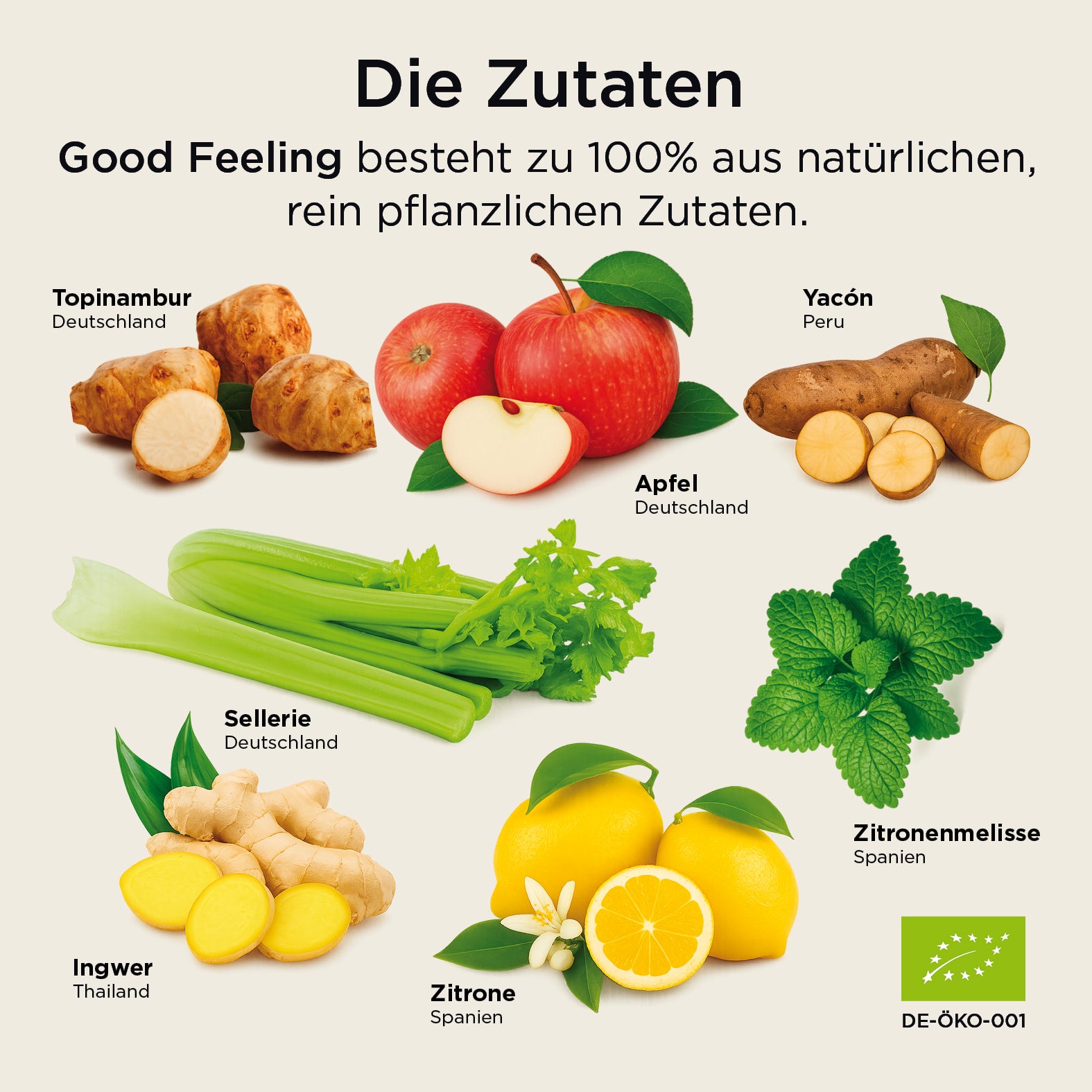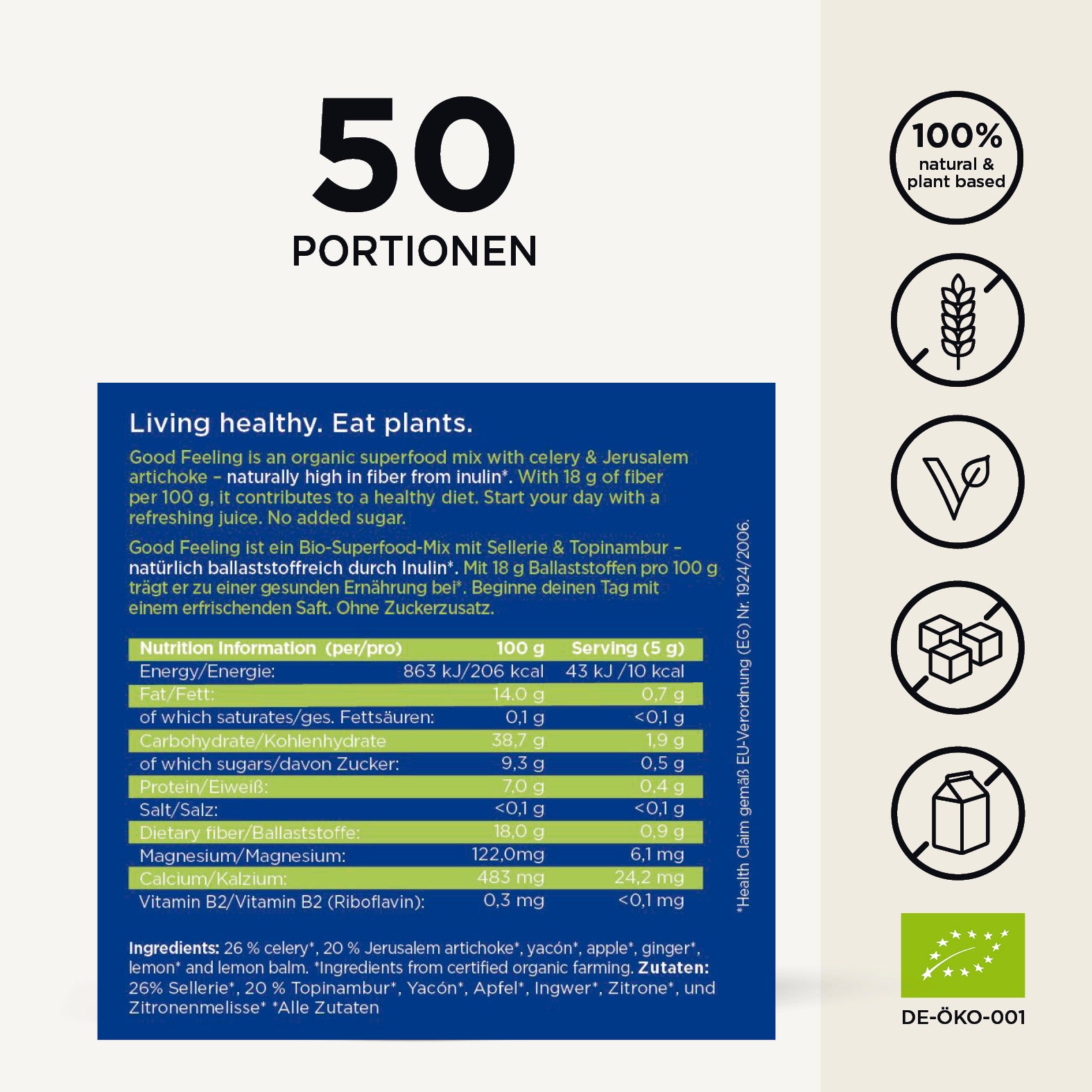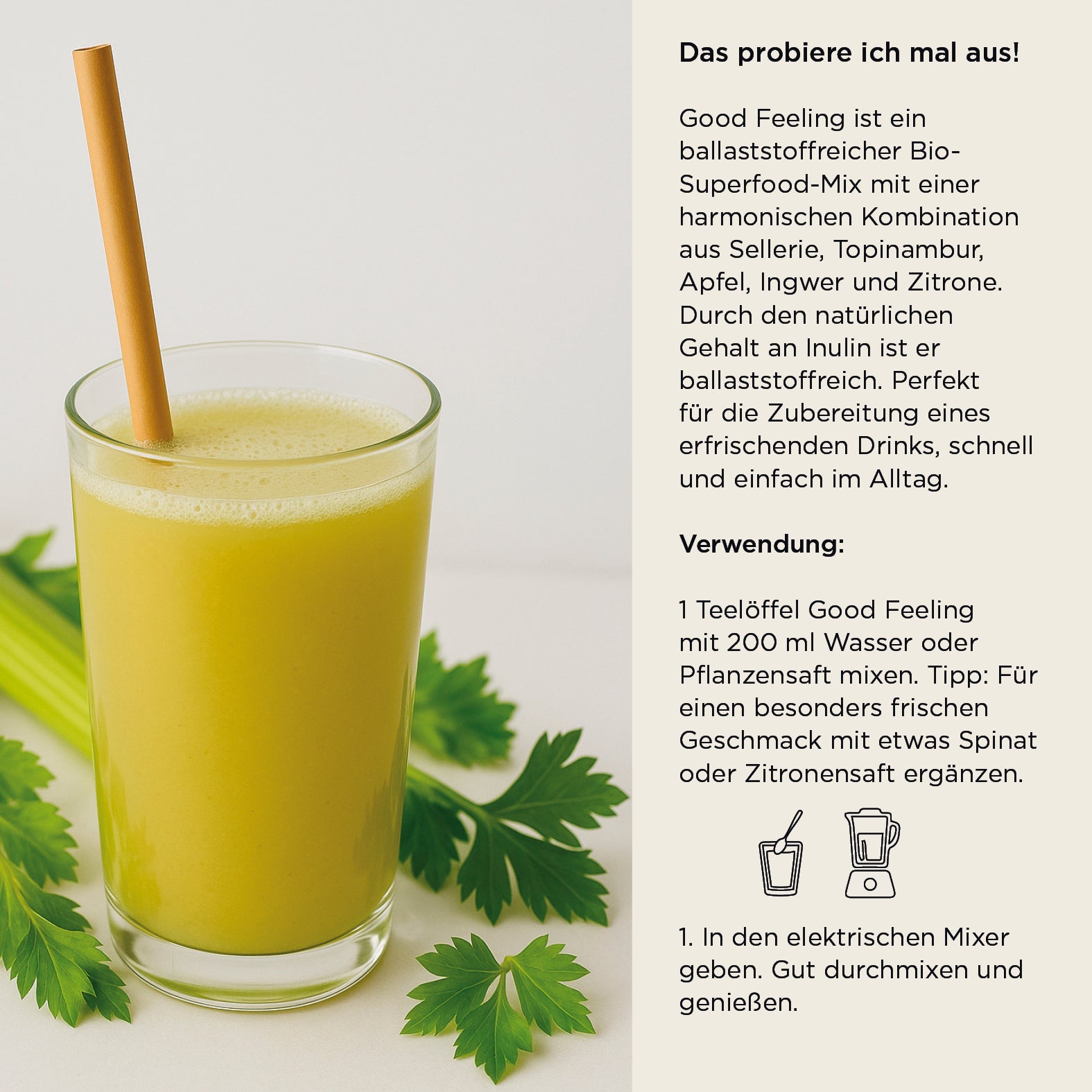 For relaxation and well-being. Good Feeling is a digestible instant celery juice with a nutrient-rich combination of superfoods. It contains fiber and promotes a good feeling. Start your day with a refreshing juice.