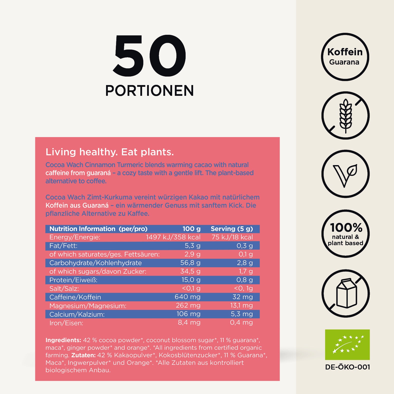 100 % Bio, vegan und frei von Gluten, Soja, Milchprodukten, Zuckerzusätzen, Füllstoffen und künstlichen Zusatzstoffen - für eine bewusste Ernährung mit reiner Pflanzenkraft. Genieße Cocoa Wach als belebende Trinkschokolade in Milch oder kreativ in anderen Rezepten. Hergestellt in Deutschland, sorgfältig, pflanzlich und clean.