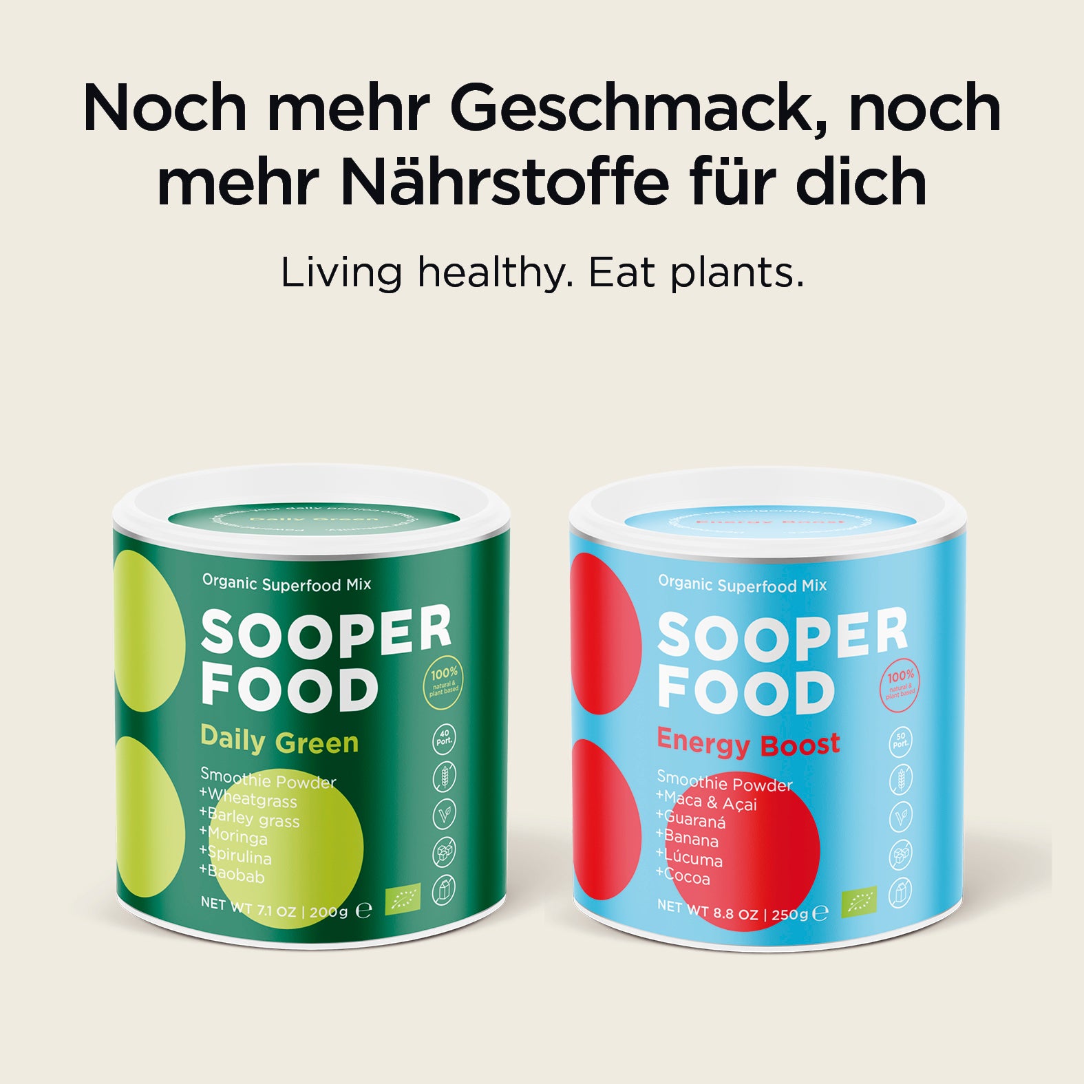 Sooperfood Daily Green ist eine ausgewogene Mischung aus Weizengras, Gerstengras, Moringa, Löwenzahn, Spinat, Spirulina, Chlorella und Baobab - inspiriert von der Kraft grüner Pflanzen und perfekt für eine frische Portion Grün in deinem Alltag.