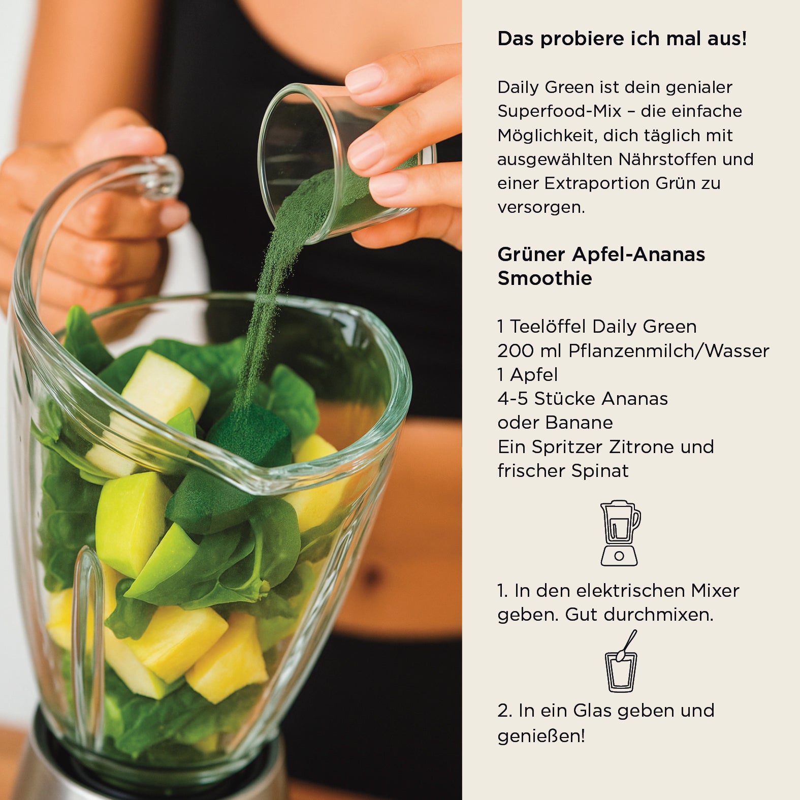 Daily Green lässt sich aber nicht nur im Smoothie genießen. Der Mix passt auch in Shakes, Bowls und verleiht sogar herzhaften Gerichten wie Suppen eine interessante Note.