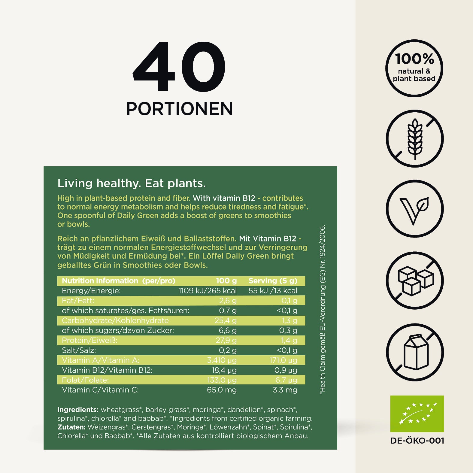 - DEINE TÄGLICHE PORTON GRÜN - Acht sorgfältig ausgewählte Bio-Zutaten wie Weizengras, Gerstengras, Moringa, Spirulina, Chlorella und Baobab machen Daily Green zu einem vielseitigen Pflanzenmix.