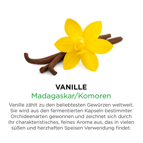 Lúcuma*, Carob*, Banane*, Chia*, Acerola* und Bourbon Vanille*. *Zutaten aus kontrolliert biologischem Anbau.