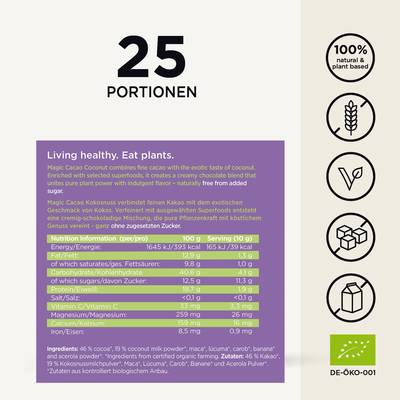 - Ein kraftvoller Mix aus Kakaopulver, Maca, Carob, Lúcuma und leckrem Kokosnussmilchpulver
