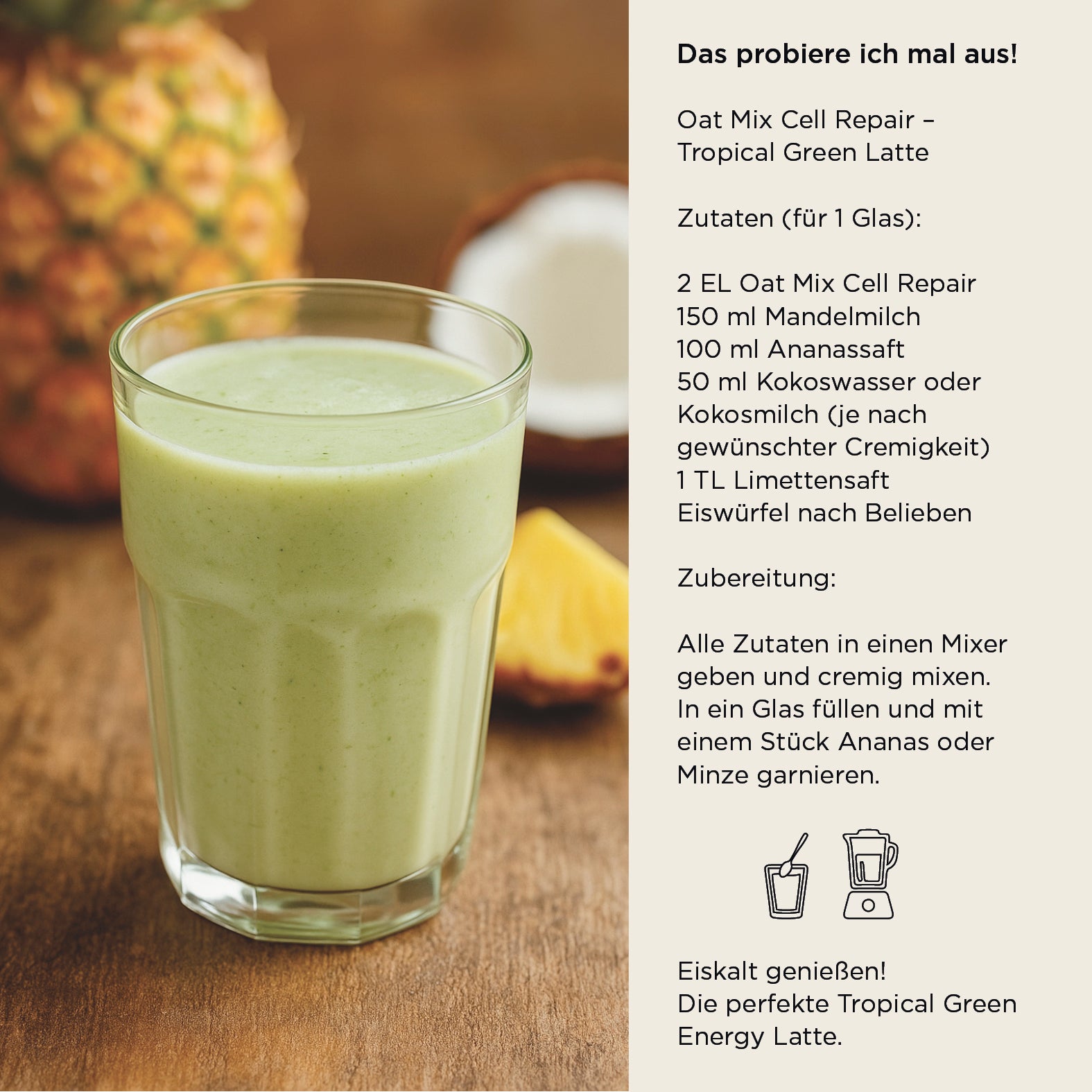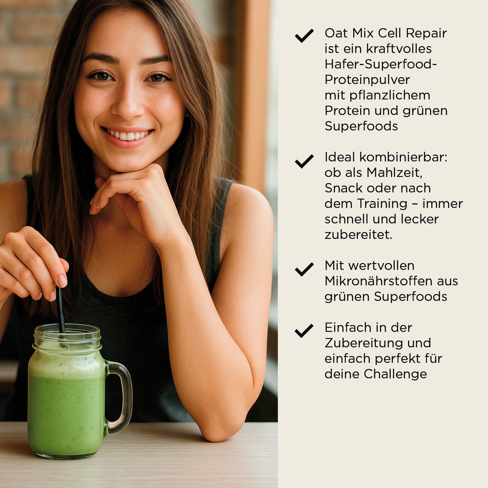 Der Oat Mix Cell Repair Mix mit pflanzlichen Proteinpulver und allen essentiellen Aminosäuren. Diese einzigartige Mischung ist absolut zuckerfrei, kohlenhydratarm und enthält Nährstoffe aus Moringa, Alfa und Spirulina für optimale Ergebnisse.