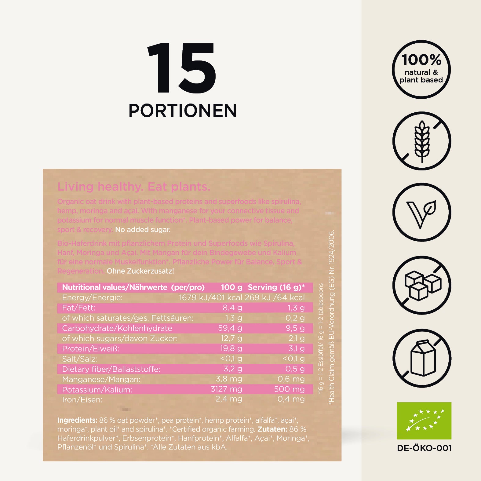 Zutaten: Hafer*, Erbsenprotein*, Hanfprotein*, 12 % Alfalfa*, Açai*, Moringa*, Pflanzenöl* und Spirulina*. *Alle Zutaten aus kontrolliert biologischem Anbau.