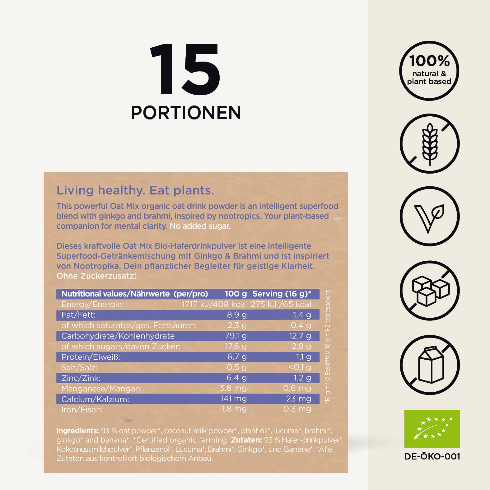 - Oat Mix Clarity Blend ist ein kraftvolles Bio-Haferdrinkpulver, das von Nootropika inspiriert ist.