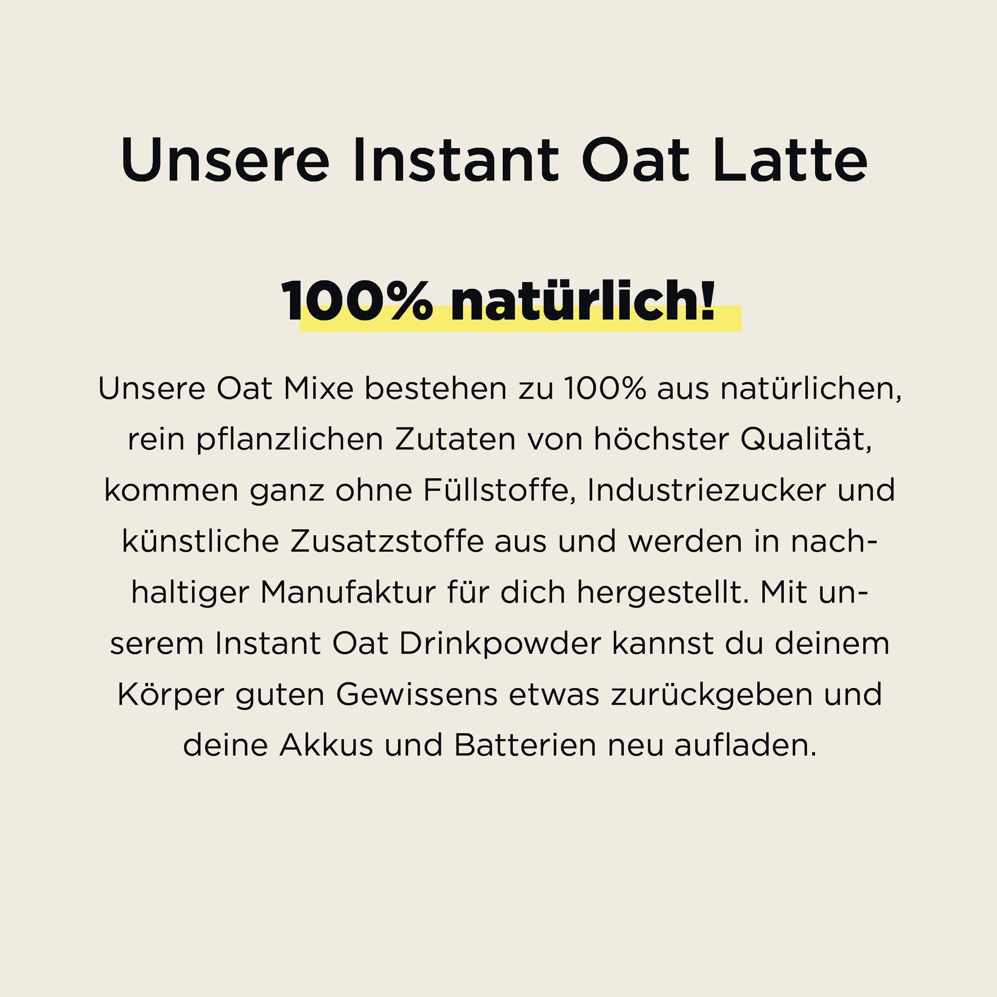 Du kannst die Intensität deiner OAT MIX Clarity Blend Latte selbst bestimmen und sie überall ganz schnell und einfach zubereiten. Einfach 1–2 gehäufte Esslöffel Pulver mit etwa 100 ml warmer oder kalter Milch/Milchalternative oder Wasser mixen.