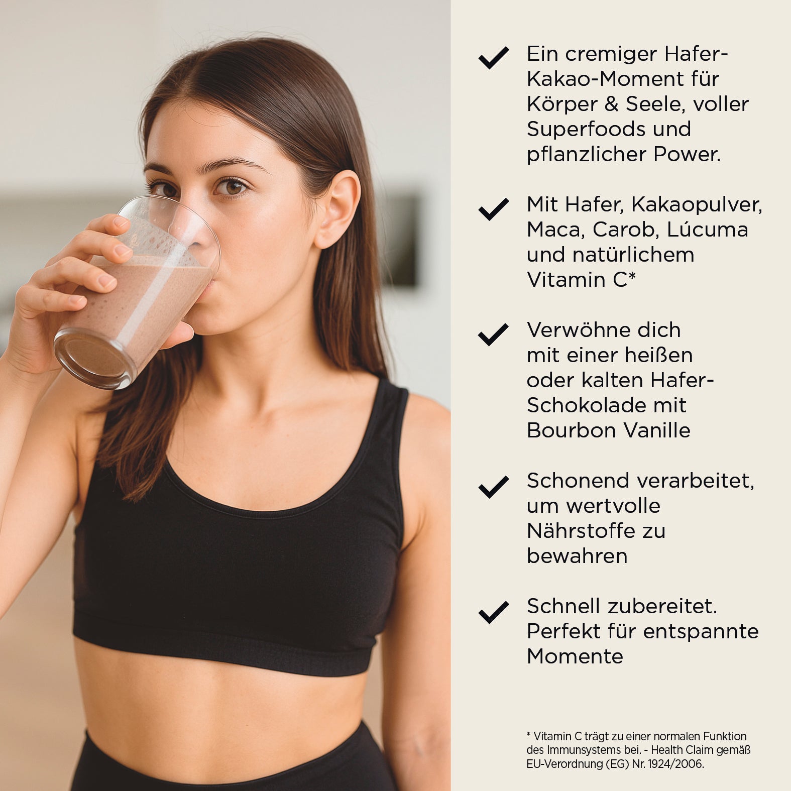 - Ein kraftvoller Mix aus Kakaopulver, Maca, Carob, Lúcuma und natürlichem Vitamin C