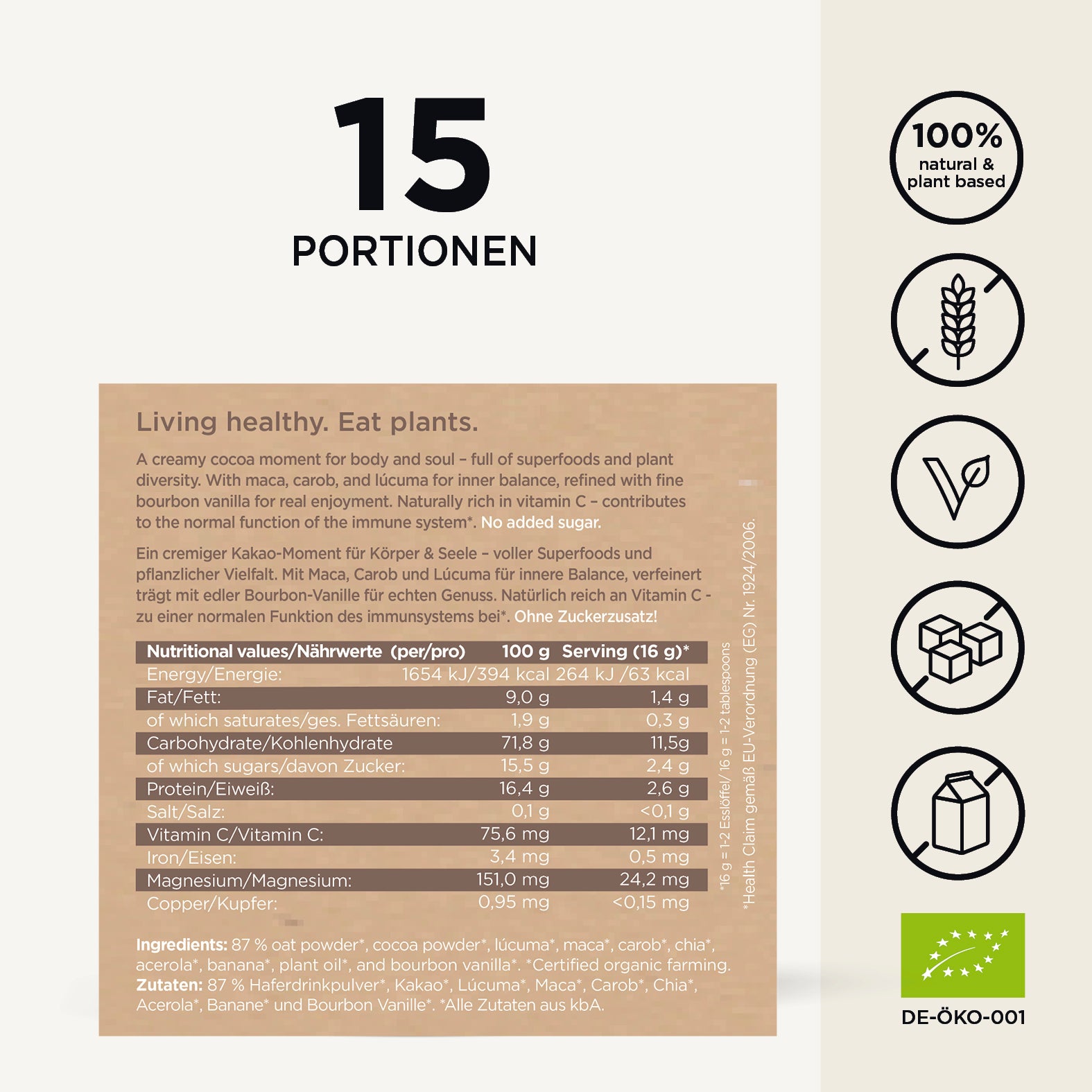 Zutaten: Hafer*, Kakao*, 7 % Lúcuma*, Maca*, Carob*, Chia*, Acerola*, Banane* und Bourbon Vanille* *Alle Zutaten aus kontrolliert biologischem Anbau.