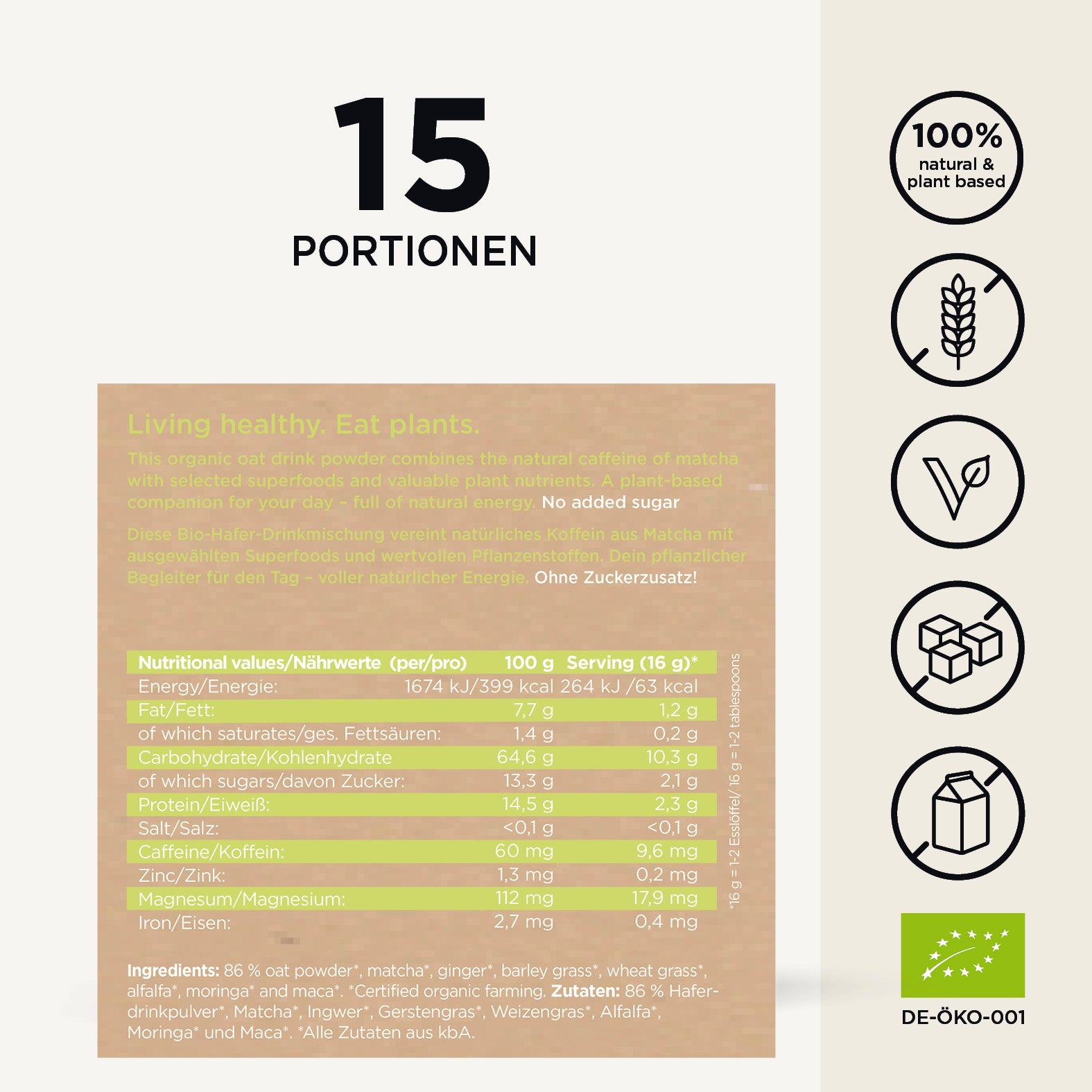 - Die Mischung kombiniert hochwertiges Bio-Haferdrinkpulver mit Matcha, Ingwer, Gerstengras, Weizengras, Alfalfa, Moringa und Maca.