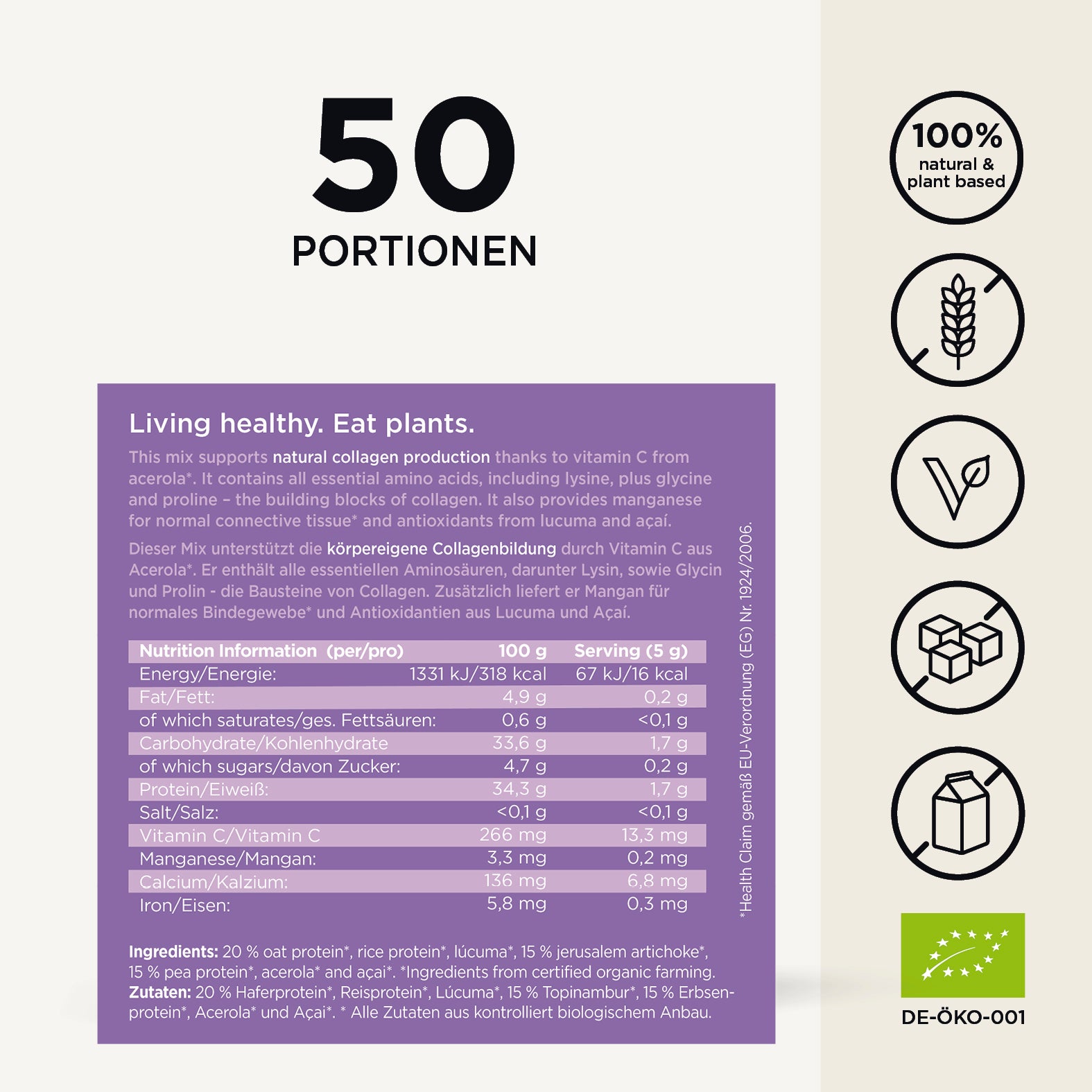 Unser Sooperfood Plant Collagen ist inspiriert von der natürlichen Fähigkeit deines Körpers, Collagen selbst zu bilden. Dafür enthält die Mischung rein pflanzliche Zutaten: Haferprotein, Reisprotein, Erbsenprotein, Lucuma, Topinambur, Acerola und Açaí.