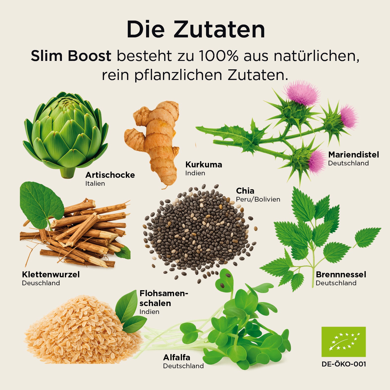 Unser Slim Boost vereint Bitterstoffe aus Artischocke, Silymarin aus der Mariendistel mit Flohsamen, Calcium, Eisen und Vitamin K1. Ein pflanzlicher Mix, der sich ideal in deinen Alltag und in deine Routine integrieren lässt - ob im Smoothie, Saft oder deinem ganz persönlichen Mix.