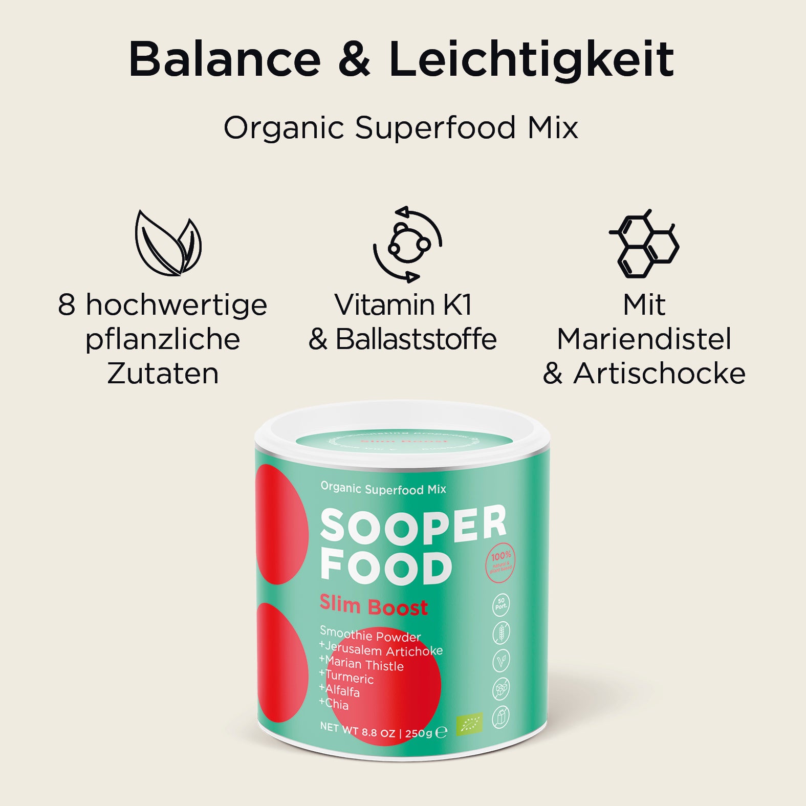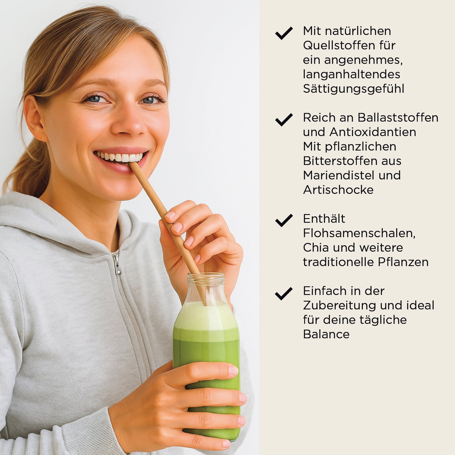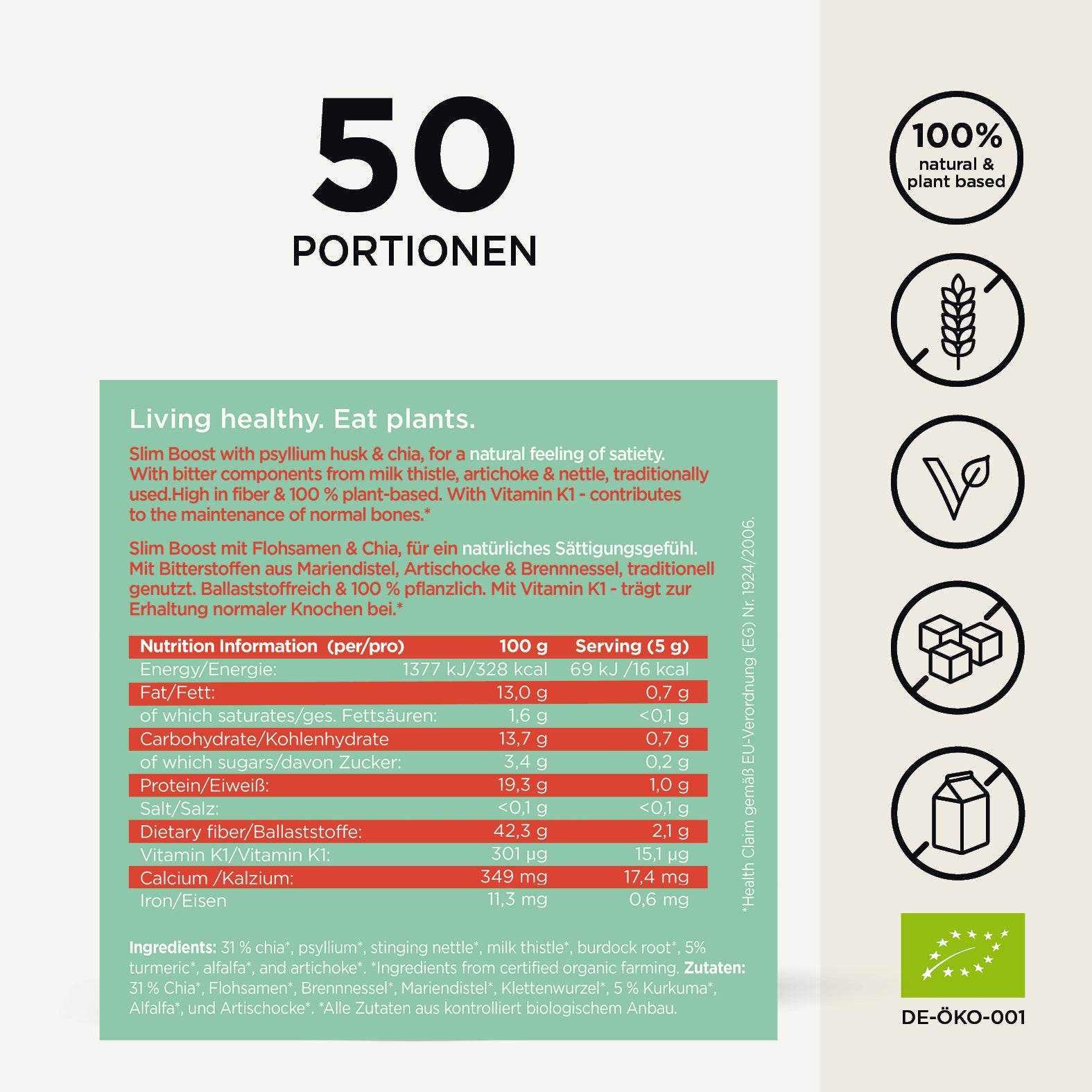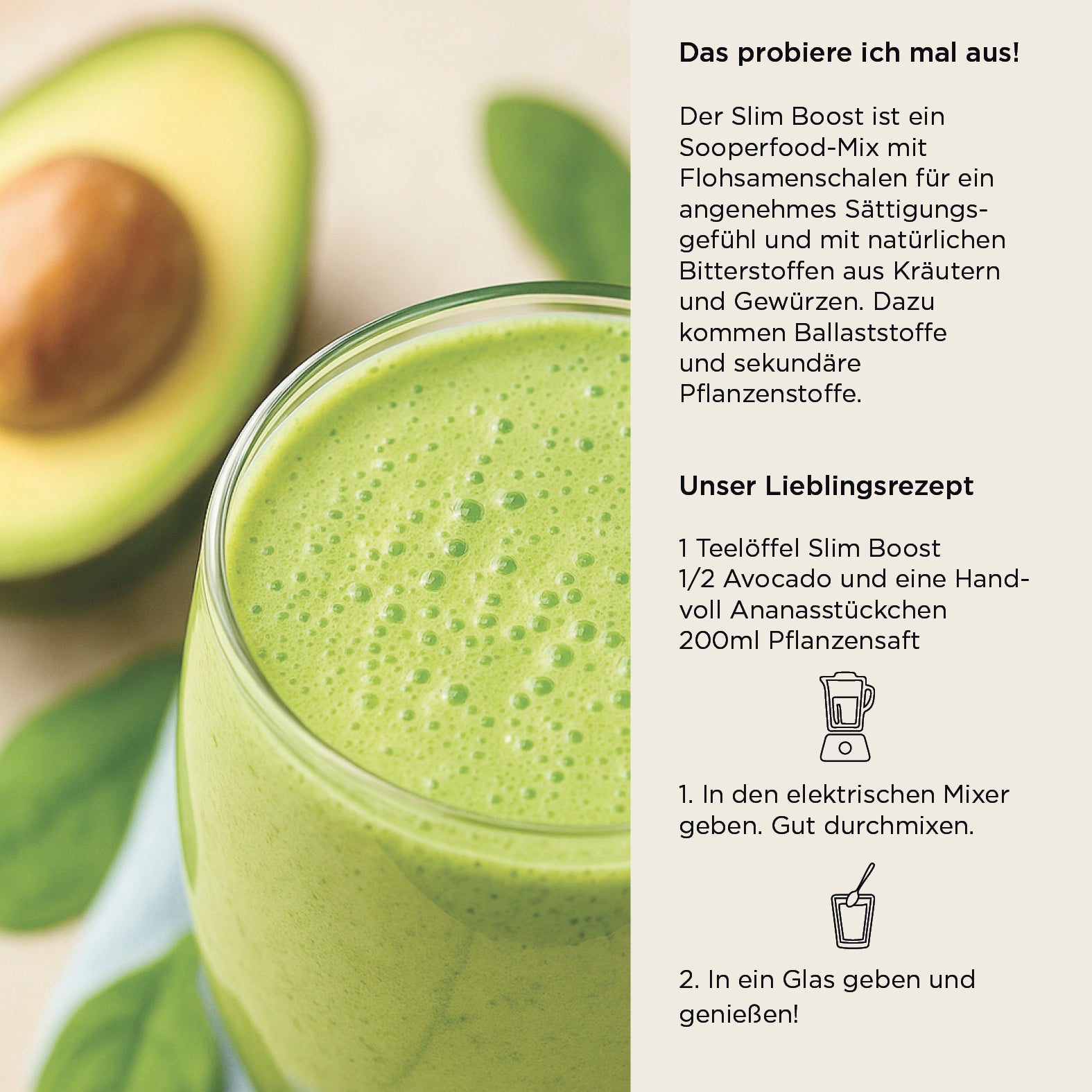 Slim Boost ist reich an Ballaststoffen, Bitterstoffen und wichtigen Mineralstoffen. Perfekt zum Einrühren in Smoothies, Shakes, Säfte oder Protein-Drinks. Flexibel kombinierbar - für eine bewusste Ernährung und deine Routine.